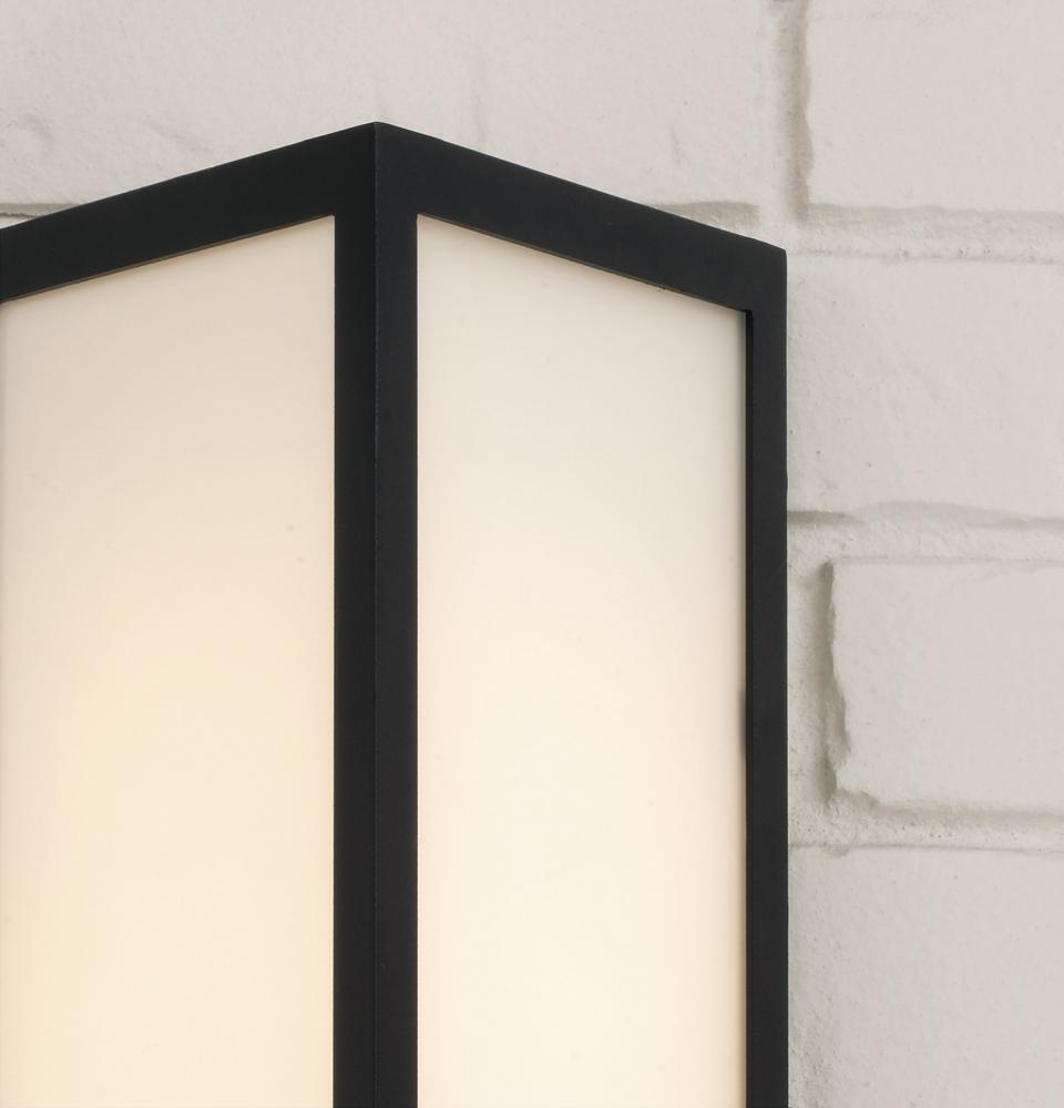 DETAILS: The sleek triangular form is accented with the contrasting Black finish and Painted White glass, bringing a soft glow to outdoor spaces.