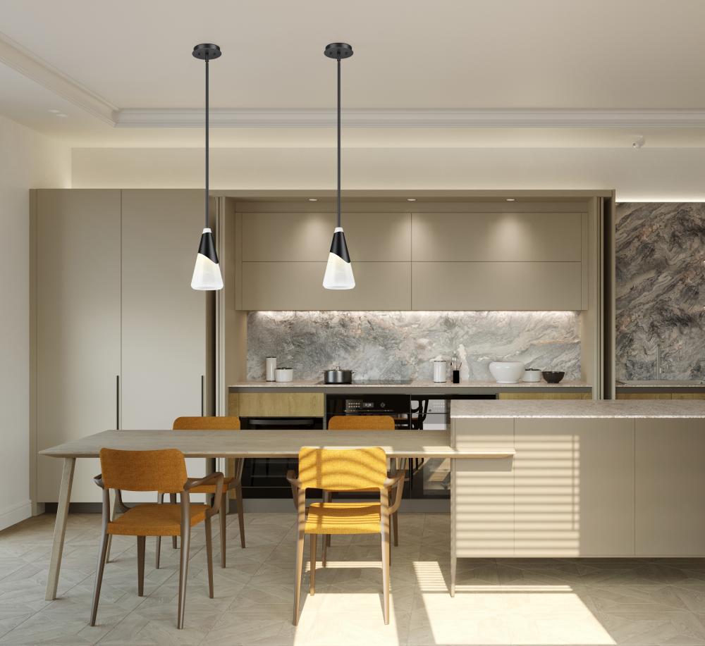 Chic curves define the graceful profile of a modern one-light pendant. Complete with a matte black finish over its canopy, downrod, and metal shroud, its a bold choice over a kitchen, bath, or living space. The shroud wraps around a conical artisan glass shade with an icy swirled pattern, creating depth while assuring soft, diffused illumination.