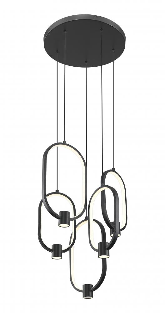 Suspending open metalwork ovals creates a notable design in this five-light LED chandelier perfect for updating kitchens, dining rooms, and living areas. Bold black matte aluminum refines the silhouetting of a festive fixture delivering LED lighting. Dimming functions add critical and useful mood lighting levels.