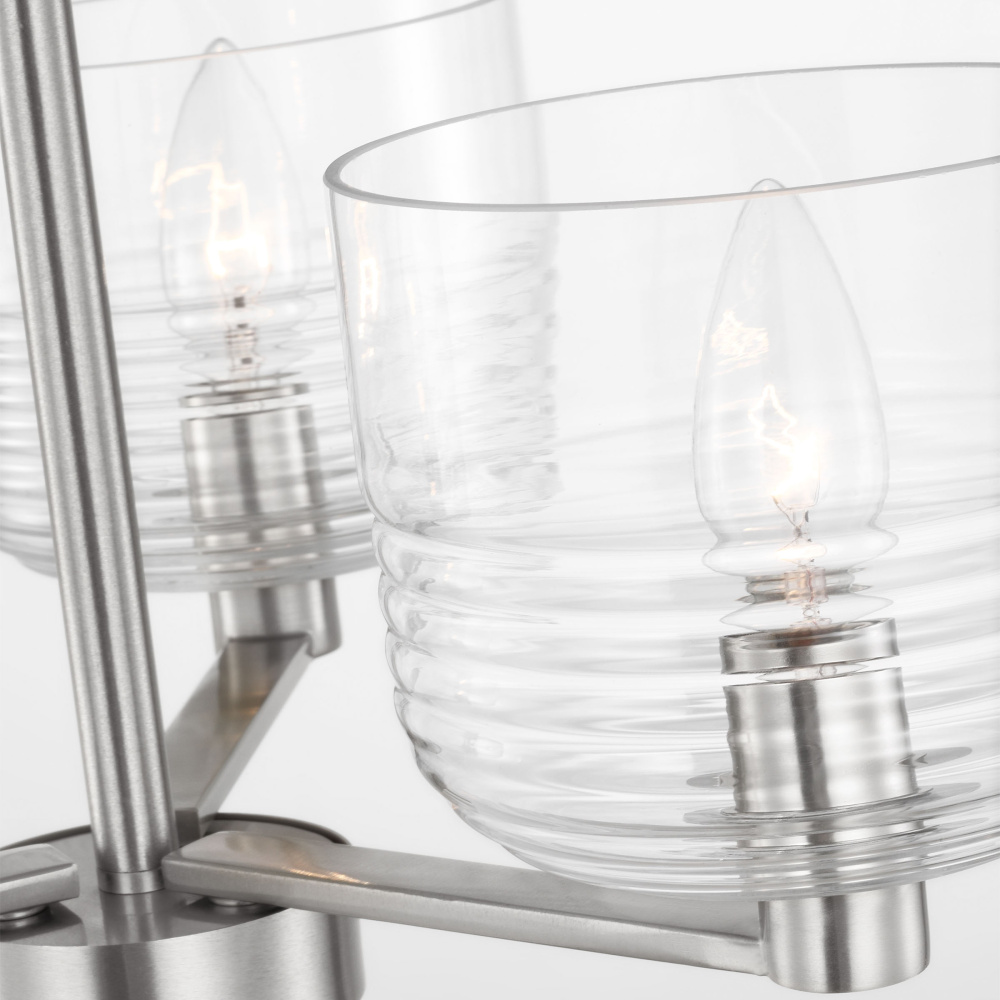 Crafted with Steel in a Brushed Nickel finish with clear ribbed glass shades